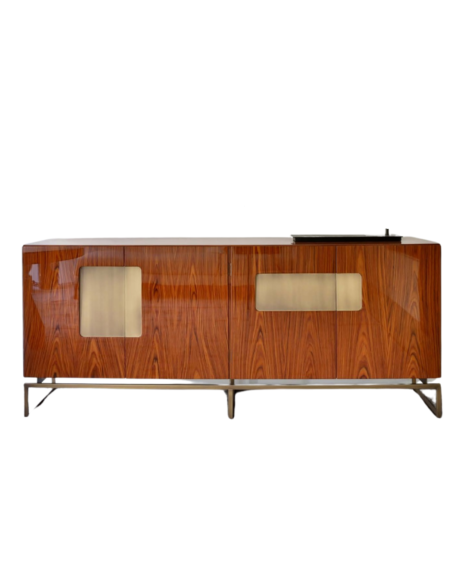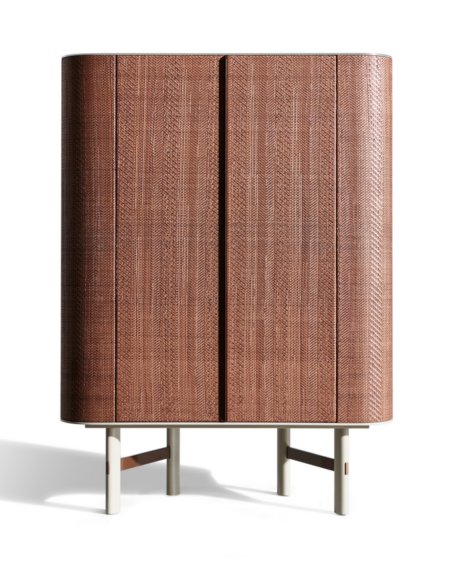 Unleash your style with Impavido, a powerful free-standing sculpture that doubles as a display piece for your favorite objects. Available in a variety of wood finishes, this asymmetrical brutalist ship holds seven drawers with luxurious leather mats. Showcased here in sandblasted Larch, it’s a true statement piece.